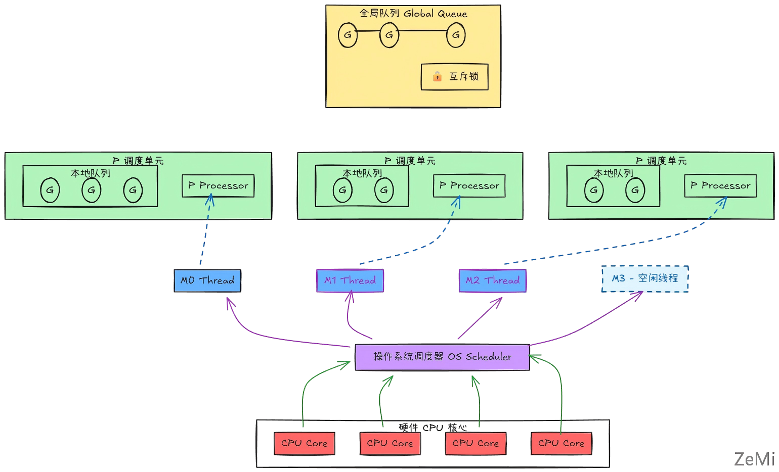 GOMAXPROCS 决定,代表了真正的并行度。Go 调度器的职责是将所有处于 runnable 状态的 Goroutines 均匀分布到在 P 上运行的 M 中。它采用了 M:N 模型:即 M 个 Goroutine 被分配到 N 个内核线程上,而这些线程运行在最多 GOMAXPROCS 个逻辑处理器(P)上。
